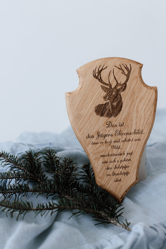 Ehrenschild | Trophäenschild | Es ist des Jägers Ehrenschild | Geschenk für Jäger | Massivholz | Rehbock | Gams | Wildschwein | Hirsch | personalisierbar
