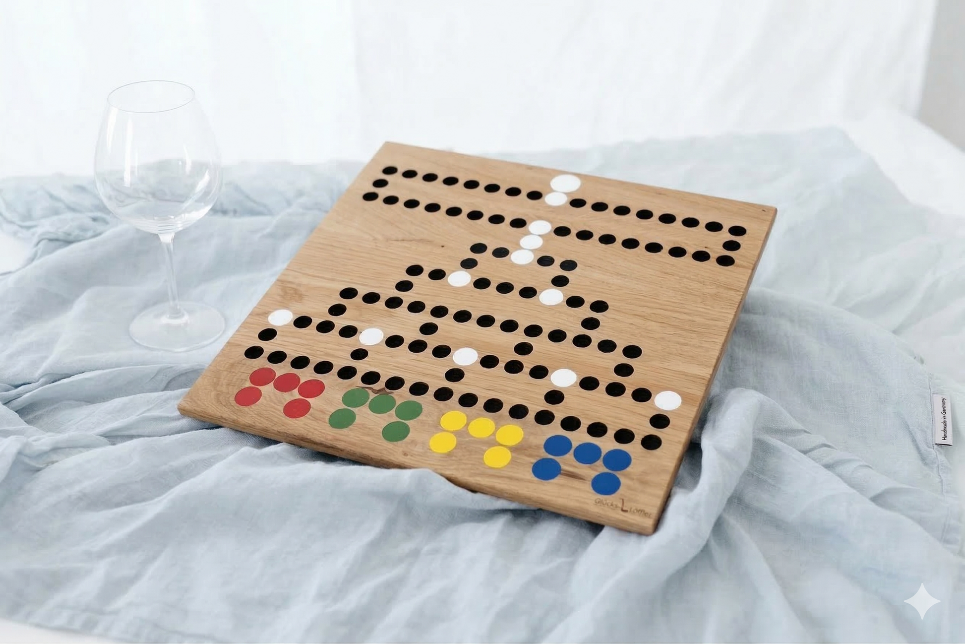 Die Spielfiguren werden aus Holz hergestellt und von Hand lackiert. Die Farbgebung erfolgt in Rot, Gelb, Blau und Grün.