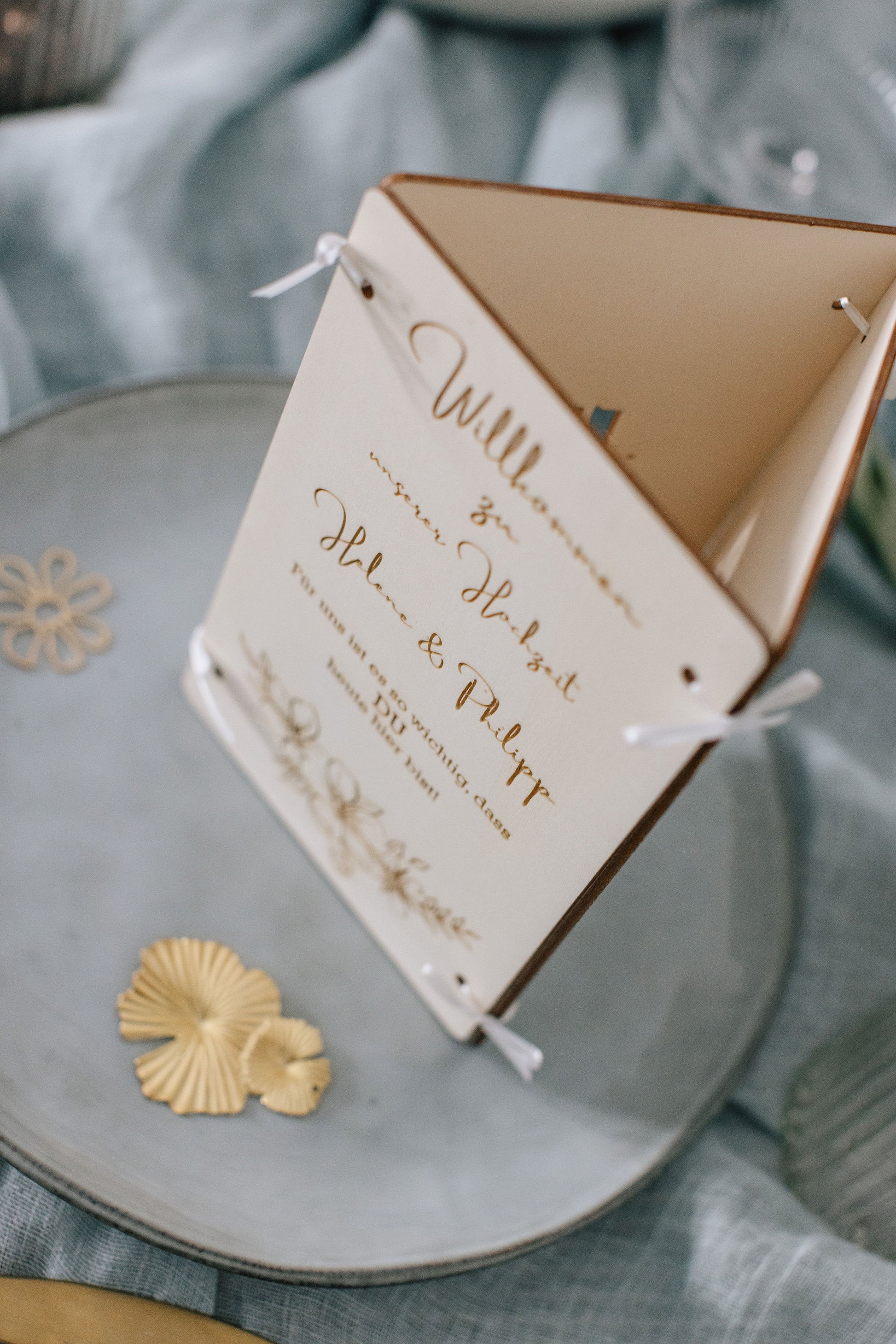 Auf der nächsten Holzplatte kann ein kleiner Willkommensgruß für eure Gäste stehen.